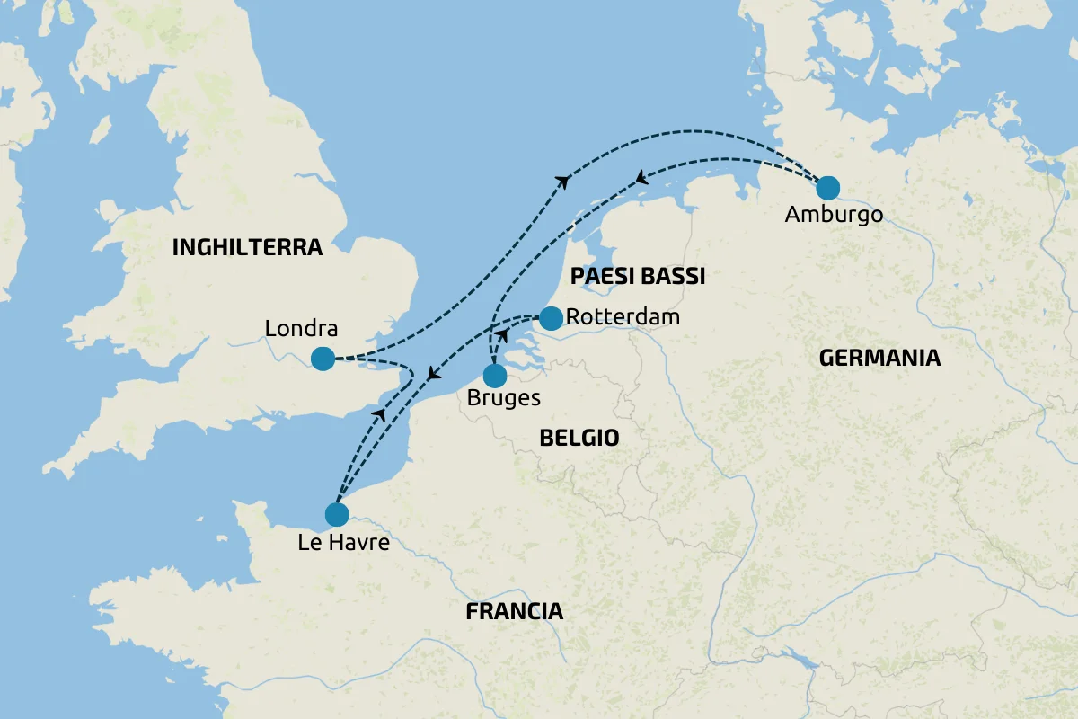 Partendo da Londra, con i suoi simboli familiari e la vivace atmosfera cosmopolita, navigherai verso Amburgo, un'affascinante città portuale con il suo mix di storia e modernità. Da lì, ti avventurerai a Rotterdam e Bruges, esplorando l'architettura contemporanea e i suggestivi canali olandesi, e assaporando il fascino medievale del Belgio. La tappa finale sarà Le Havre, porta d'accesso a Parigi, dove potrai immergerti nella cultura francese e ammirare la rinascita architettonica della città.