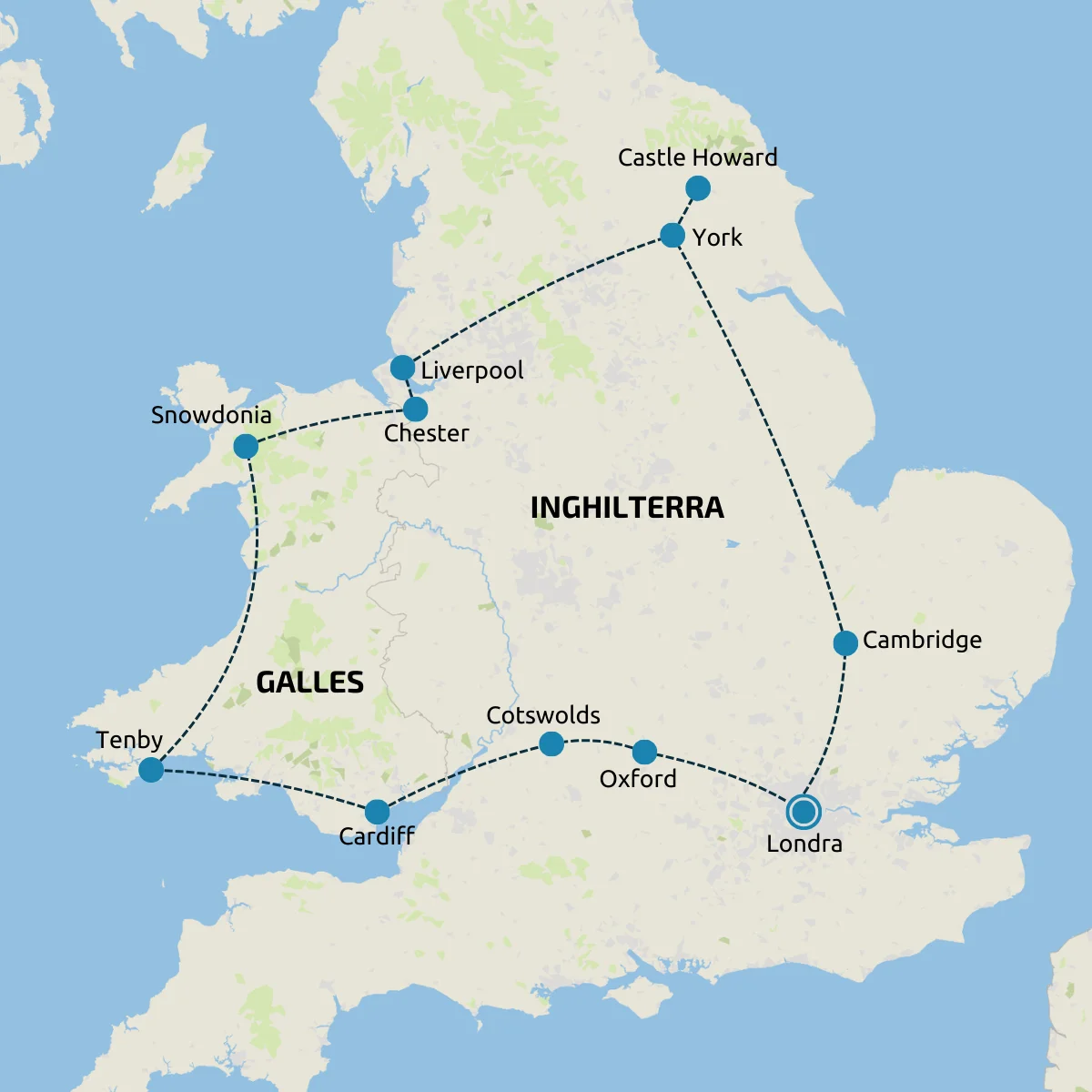 Dalla vivace Londra, con i suoi monumenti simbolo, si raggiungono l’elegante Cambridge e la medievale York, ricca di storia e atmosfera. Liverpool racconta la sua anima musicale e marittima, mentre Chester e i castelli gallesi evocano antiche tradizioni. I panorami spettacolari dello Snowdonia National Park e le coste pittoresche di Tenby offrono scorci indimenticabili. Il tour prosegue tra la vivace Cardiff e i romantici villaggi delle Cotswolds, fino alla prestigiosa Oxford, celebre per la sua università.